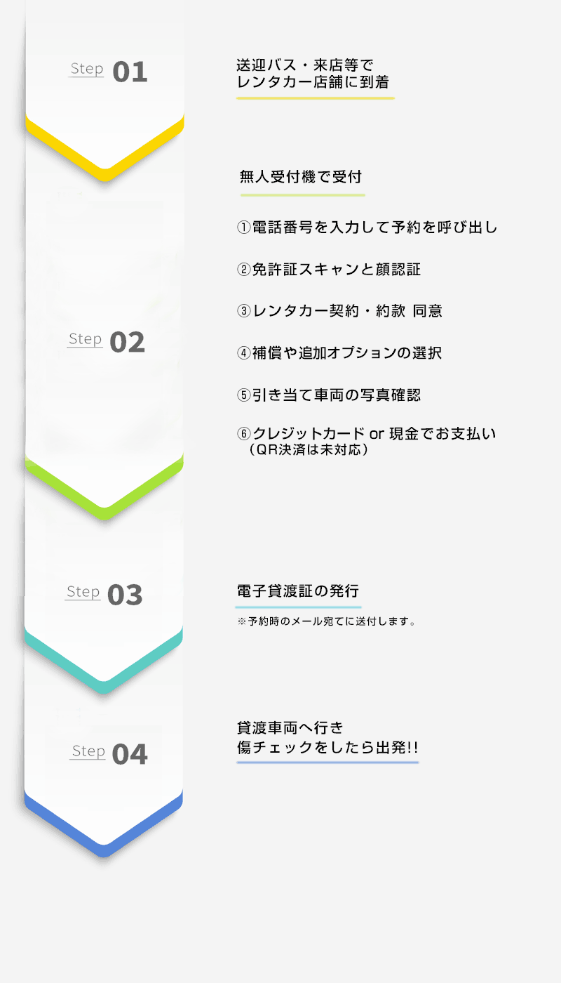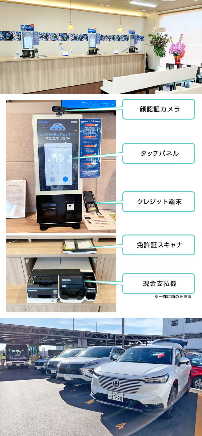 スカイレンタカーでレンタカーの受付待ち時間を解消するため、無人受付機の導入を開始しました。 複数組での同時受付が可能なので、店舗についてすぐ受付が可能になります。 契約内容は予約時のメールアドレスに電子貸渡証が送信されます(電子貸渡証は受付時に発行されるレシートのQRコードからもご確認いただけます) 出発時の車の状態も写真でいつでも確認できるため安心です。