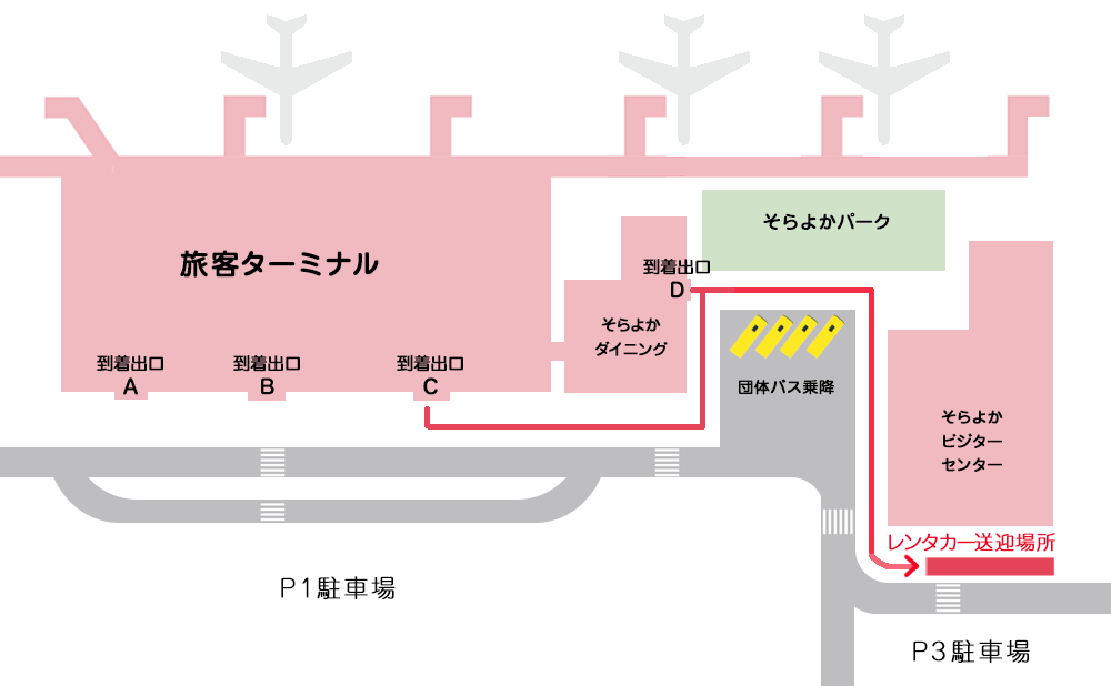 到着ロビーをでられてセブンイレブンやタリーズコーヒーの通路を直進し、そらよかダイニングと書いてある一番奥まで進んでいただくと到着出口 Dがございます。 出口Dを出て一番奥の自動ドア付近に黒い看板で『レンタカー民間駐車場』と書かれた看板がありますのでレンタカー民間駐車場までご移動をお願いいたします。